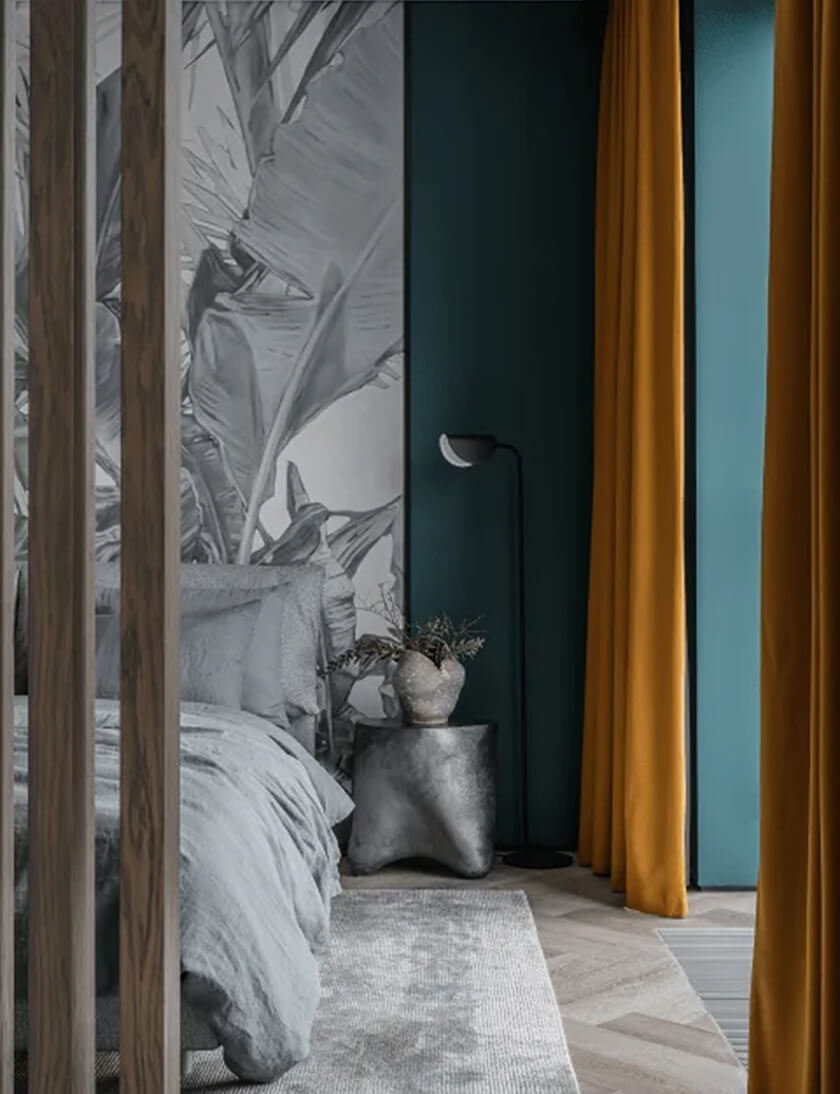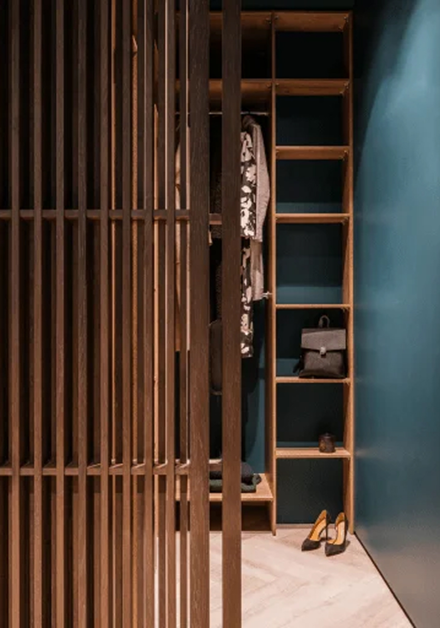 Это квартира для сдачи и было продумано, чтобы спальня — кухня — гостиная — прихожая — были одной зоной и разделение только рейками или стеной, но не до конца. Это пространство легкое и воздушное